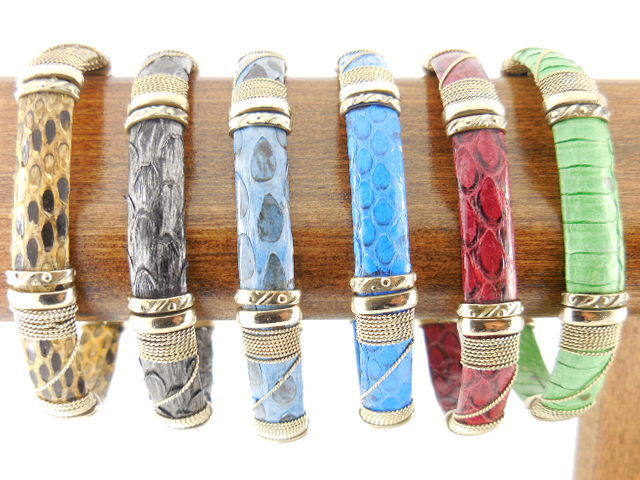 The leather bracelets are available in wide, narrow and a variety of color combinations. They are made incorporating not only leather, but also copper, brass and german silver (or alpaca as it is known in Mexico). The sea glass line uses alpaca and silver plate. The cast imported items are made from a metal alloy and will last a long time without tarnishing.