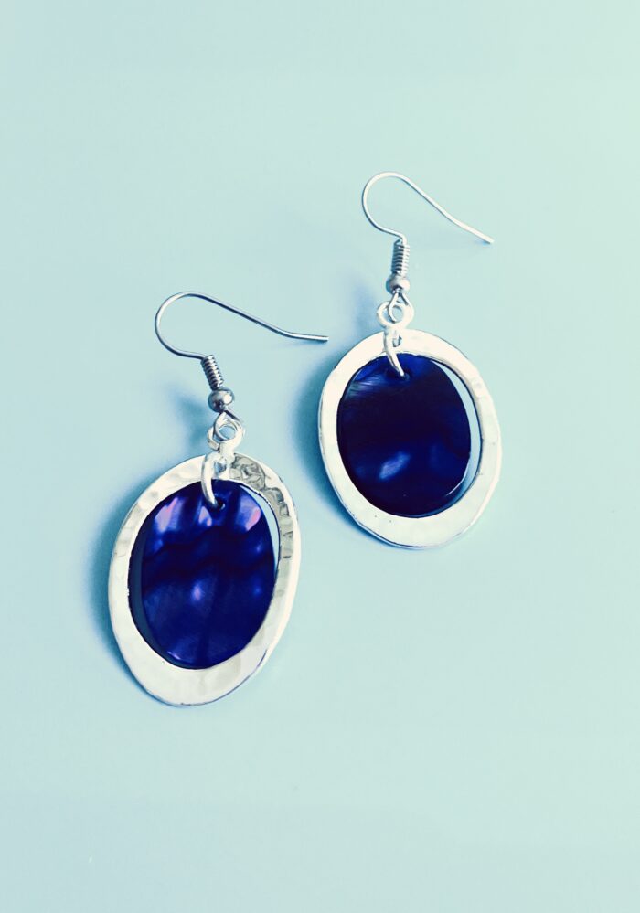Oval purple shell earrings with metal hoop