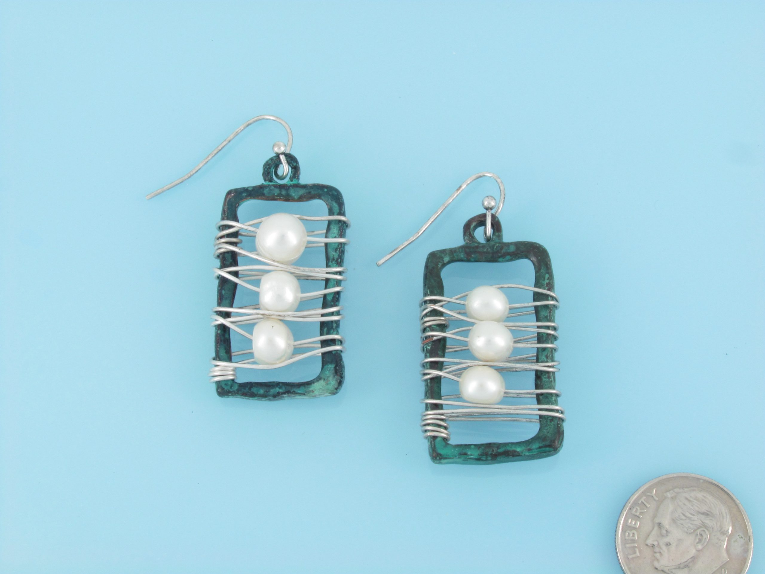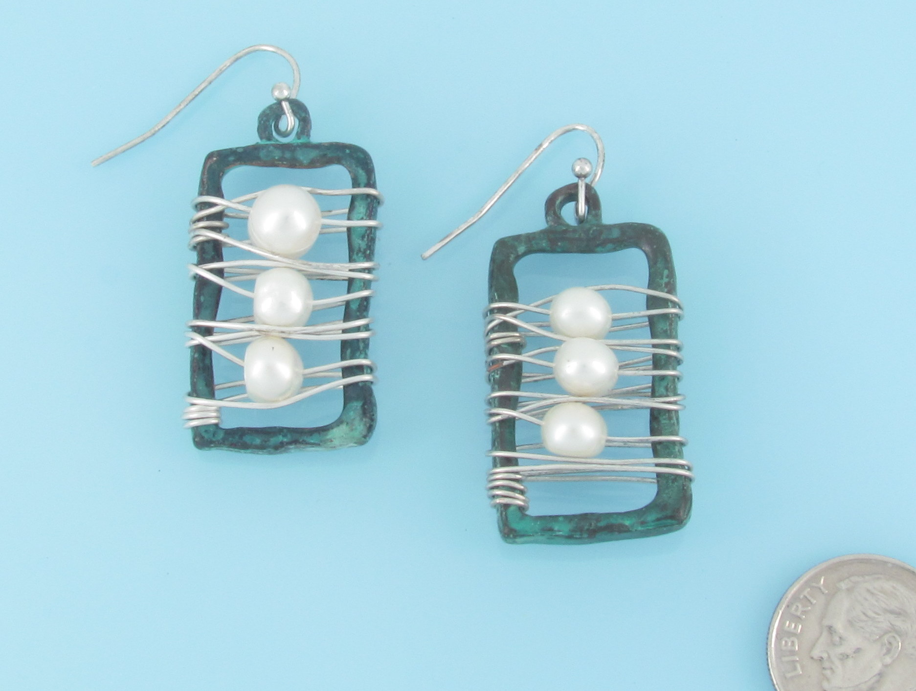 Patina wire wraped rectangles with three pearls