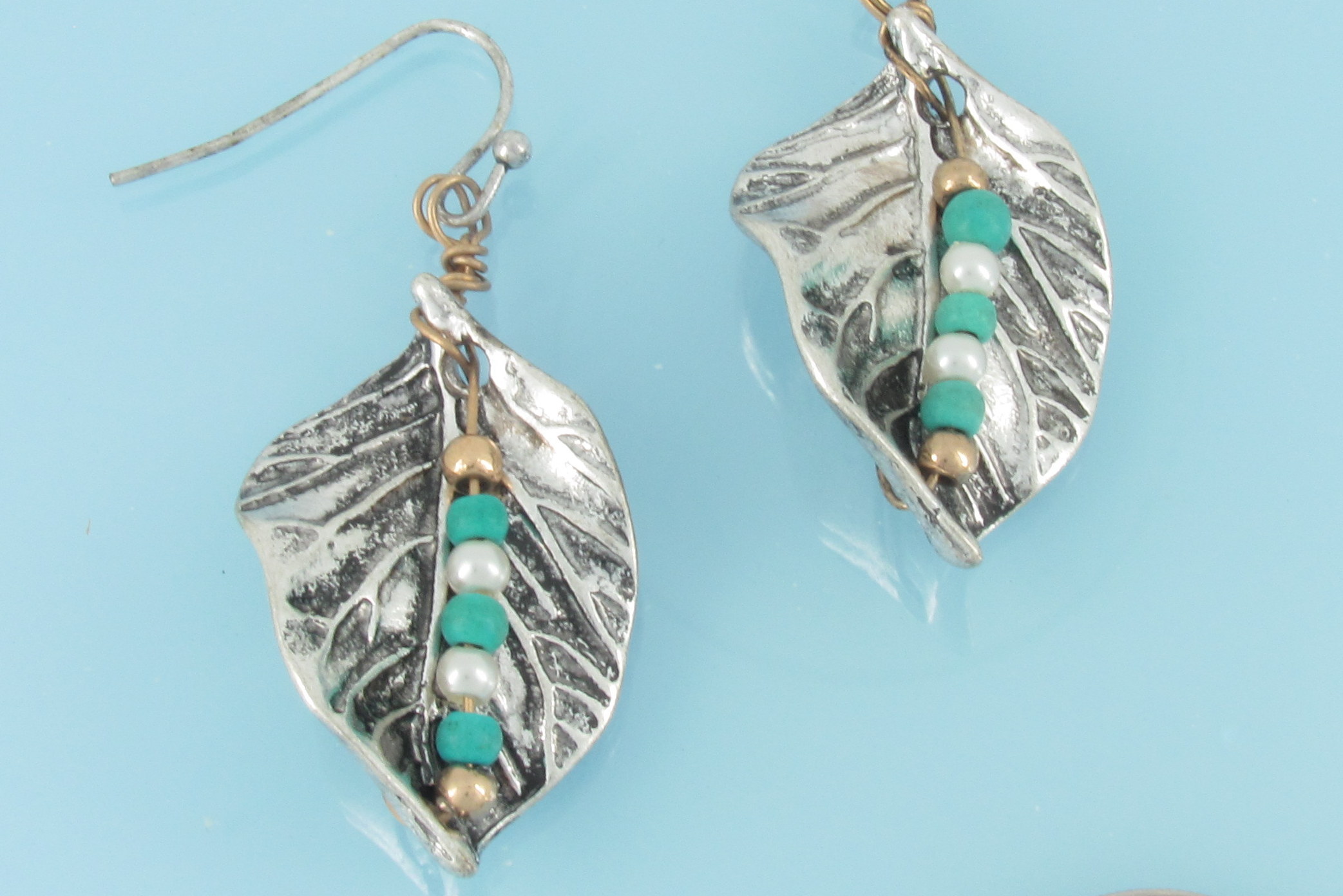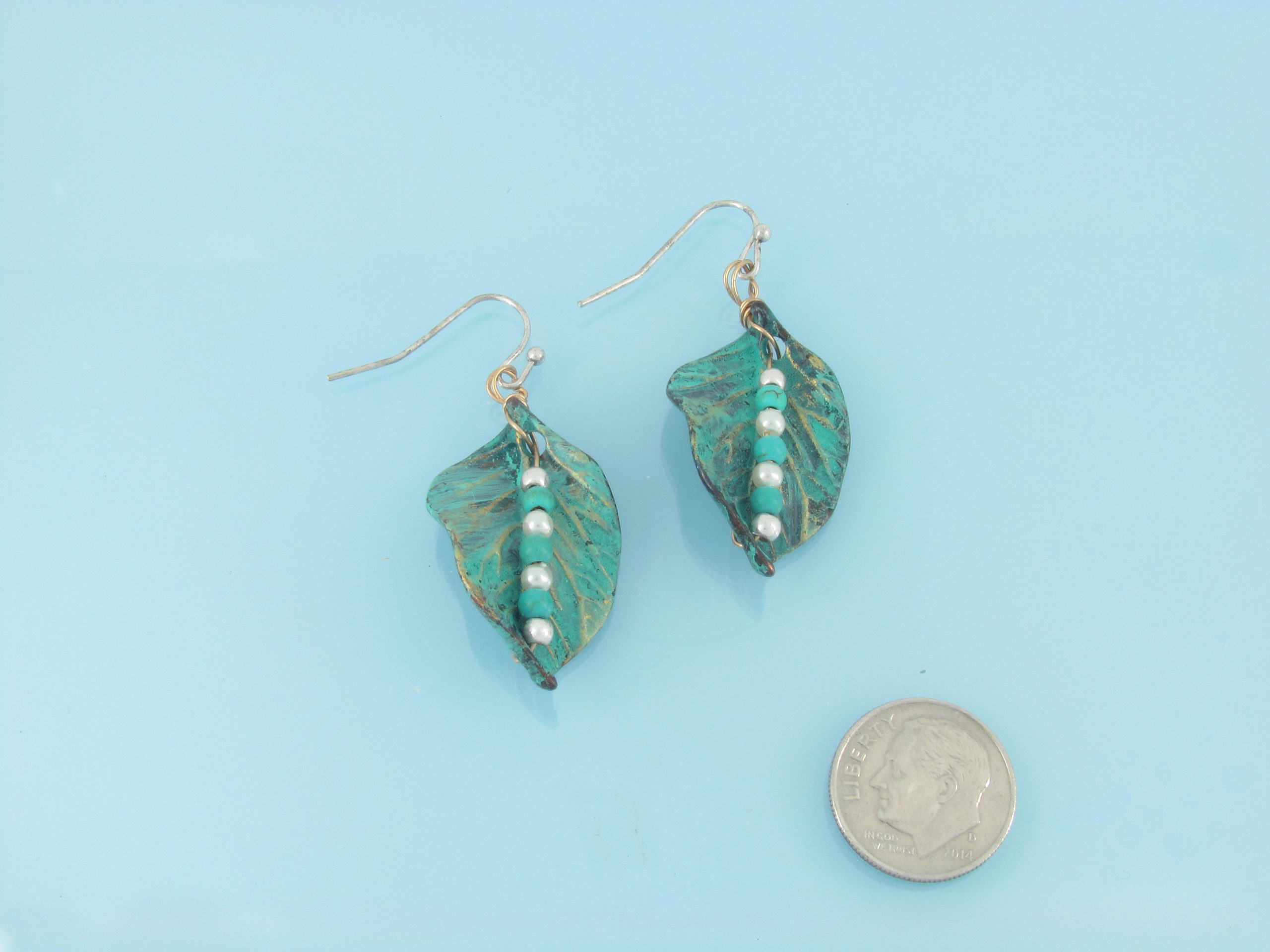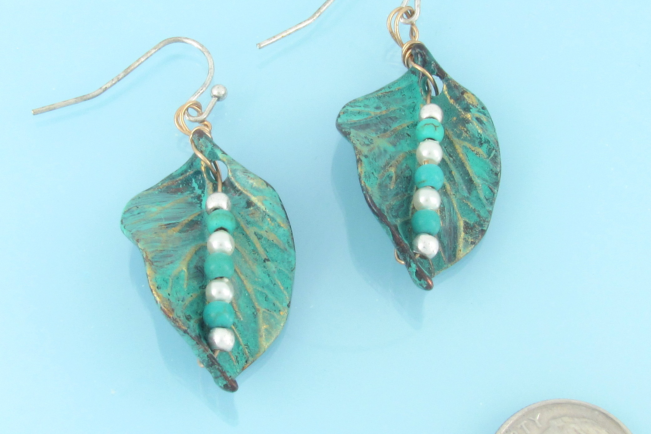 Patina leaf earrings with bead accents