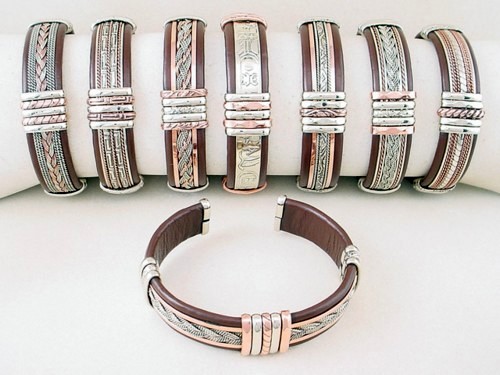 Brown Leather bracelet wide with copper – women or small men sized