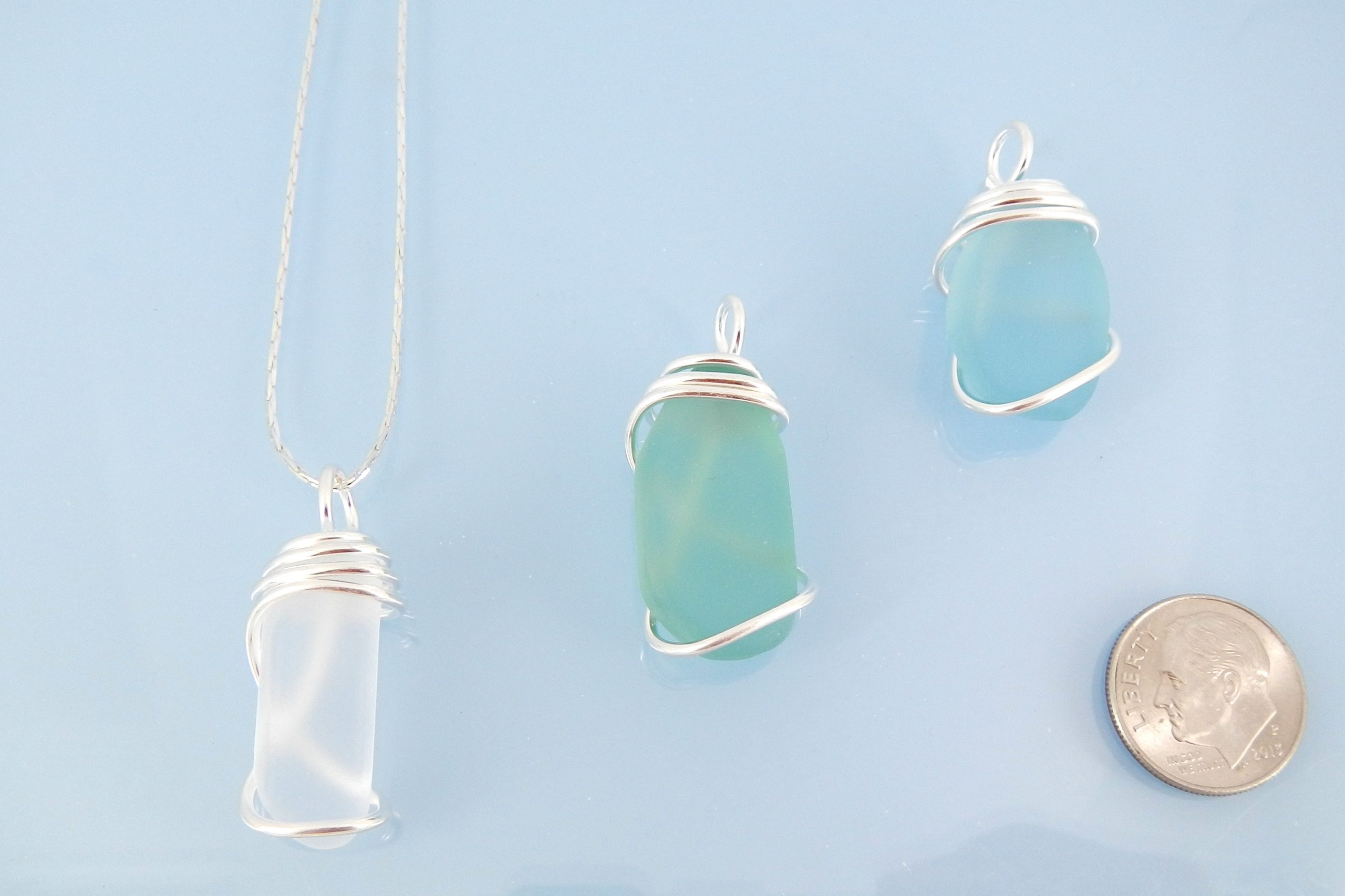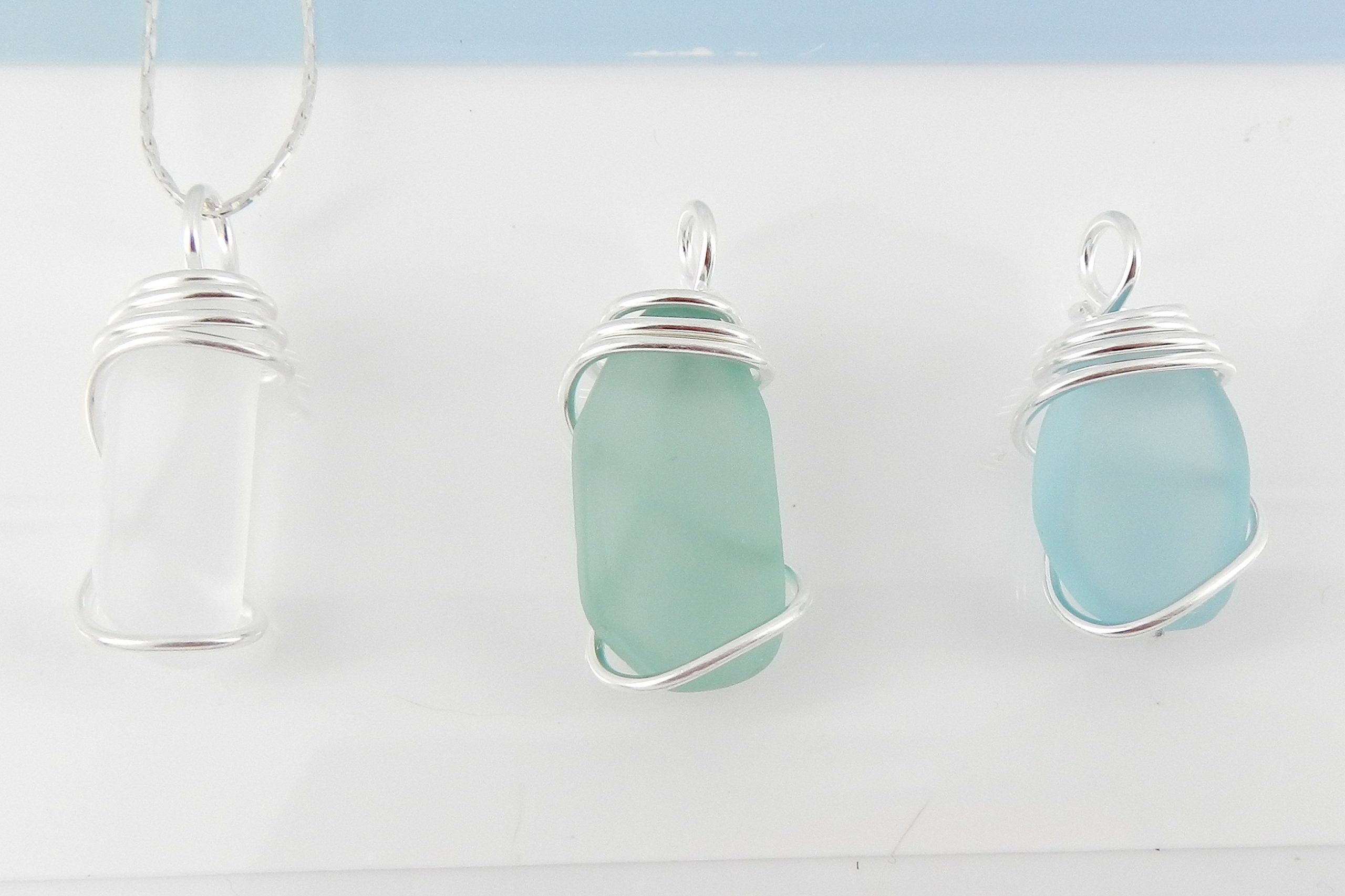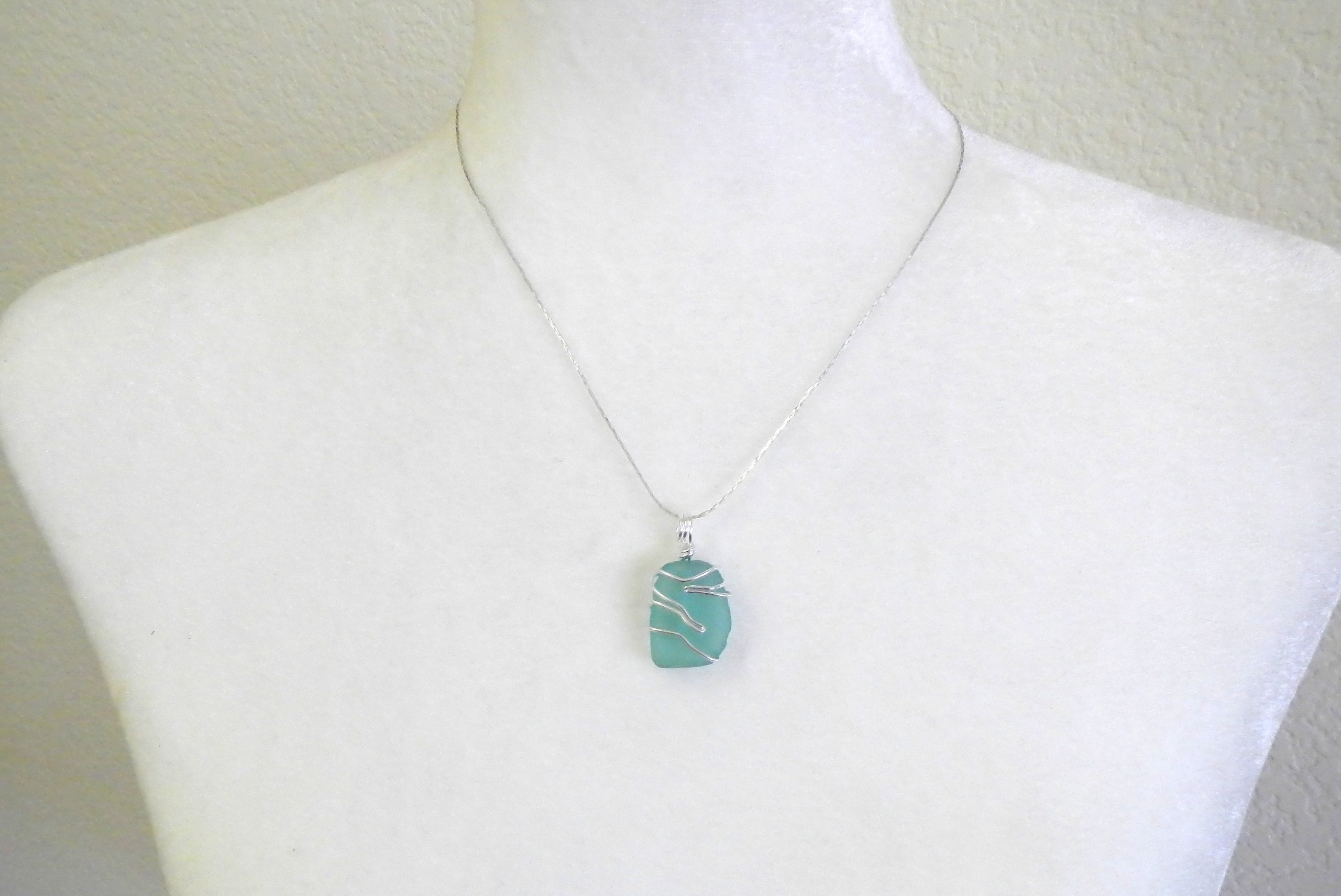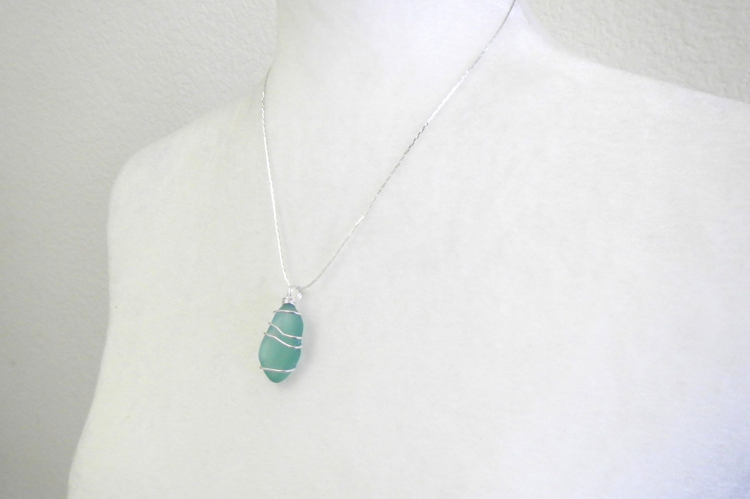 Sea glass necklace with wire wrapped top on silver plate chain