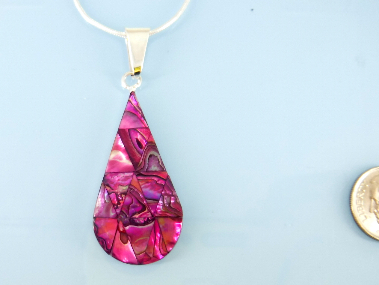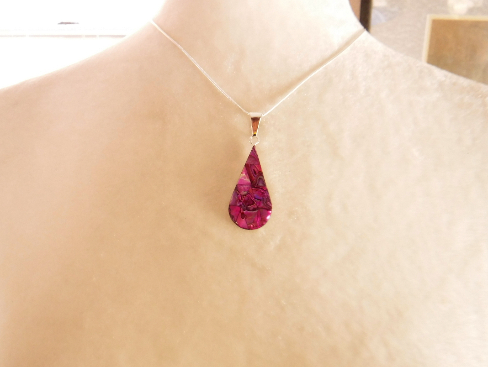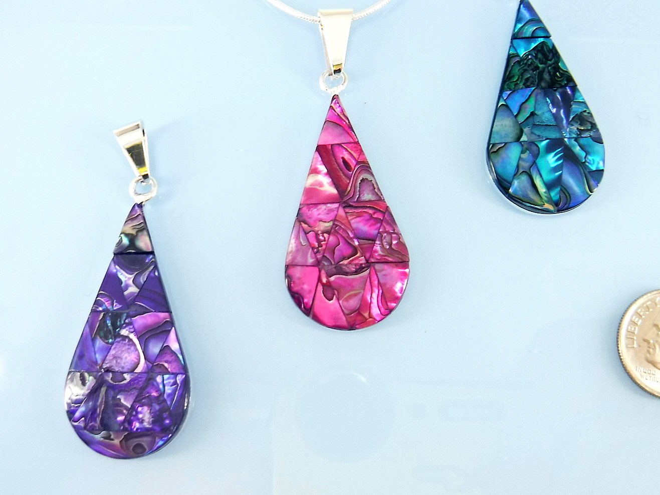 Teardrop shell inlay necklace. Coming soon. Please preorder. Please note color choice in note box. Purple, green, blue or pink.