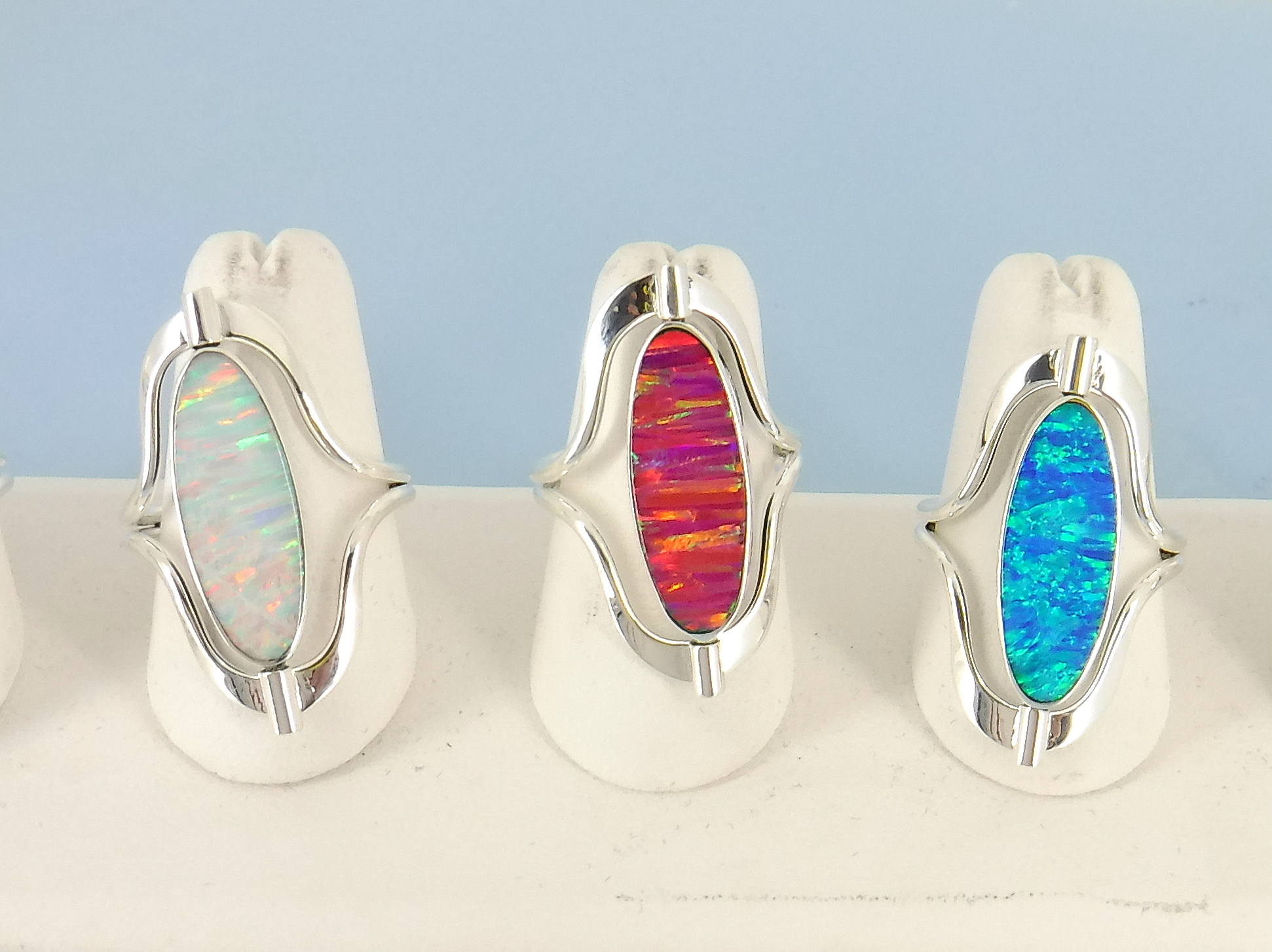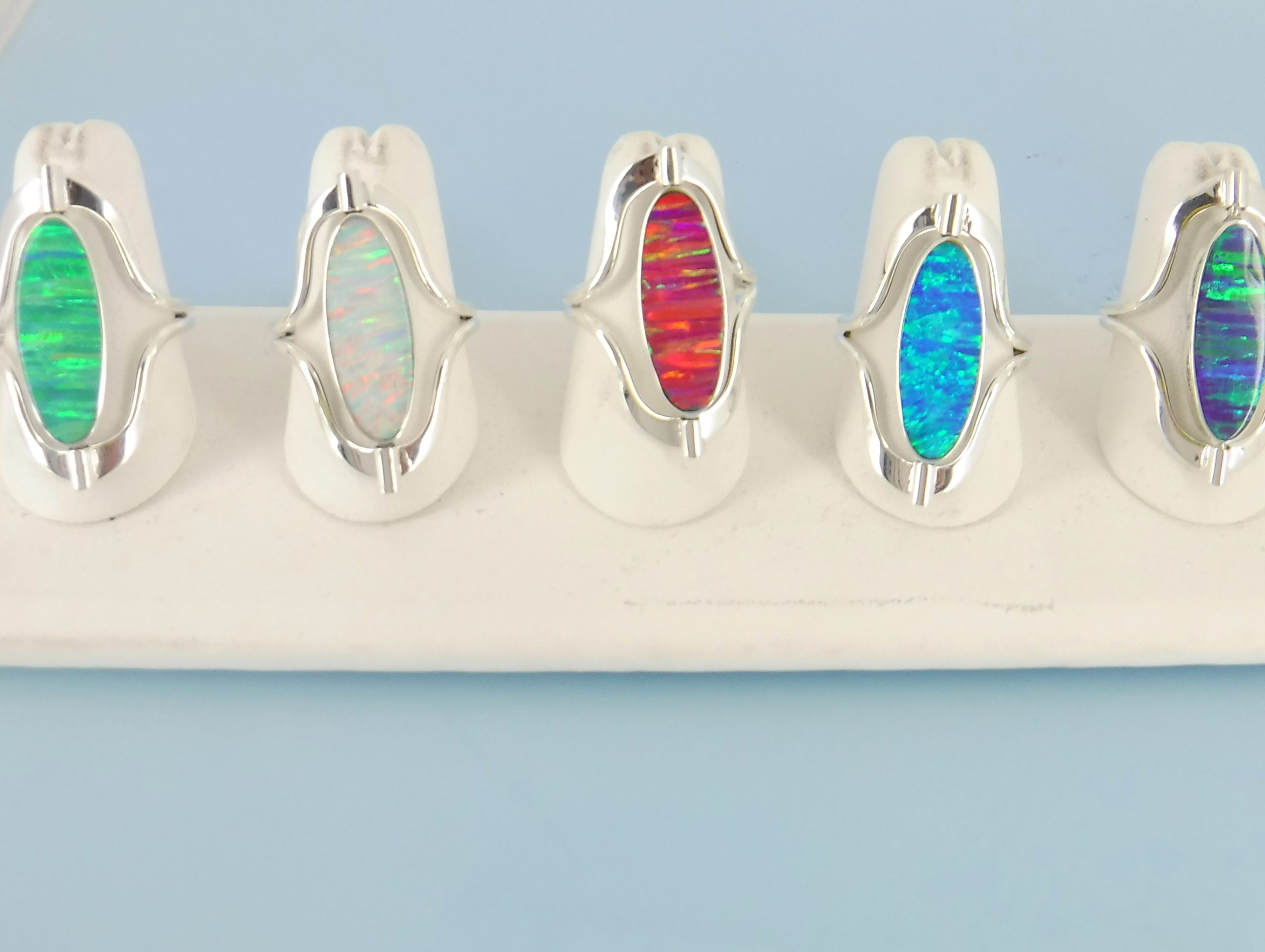 Faux opal rings in assorted colors. Green, blue, pink, white each with black. They flip!!! Sized 6,7,8,