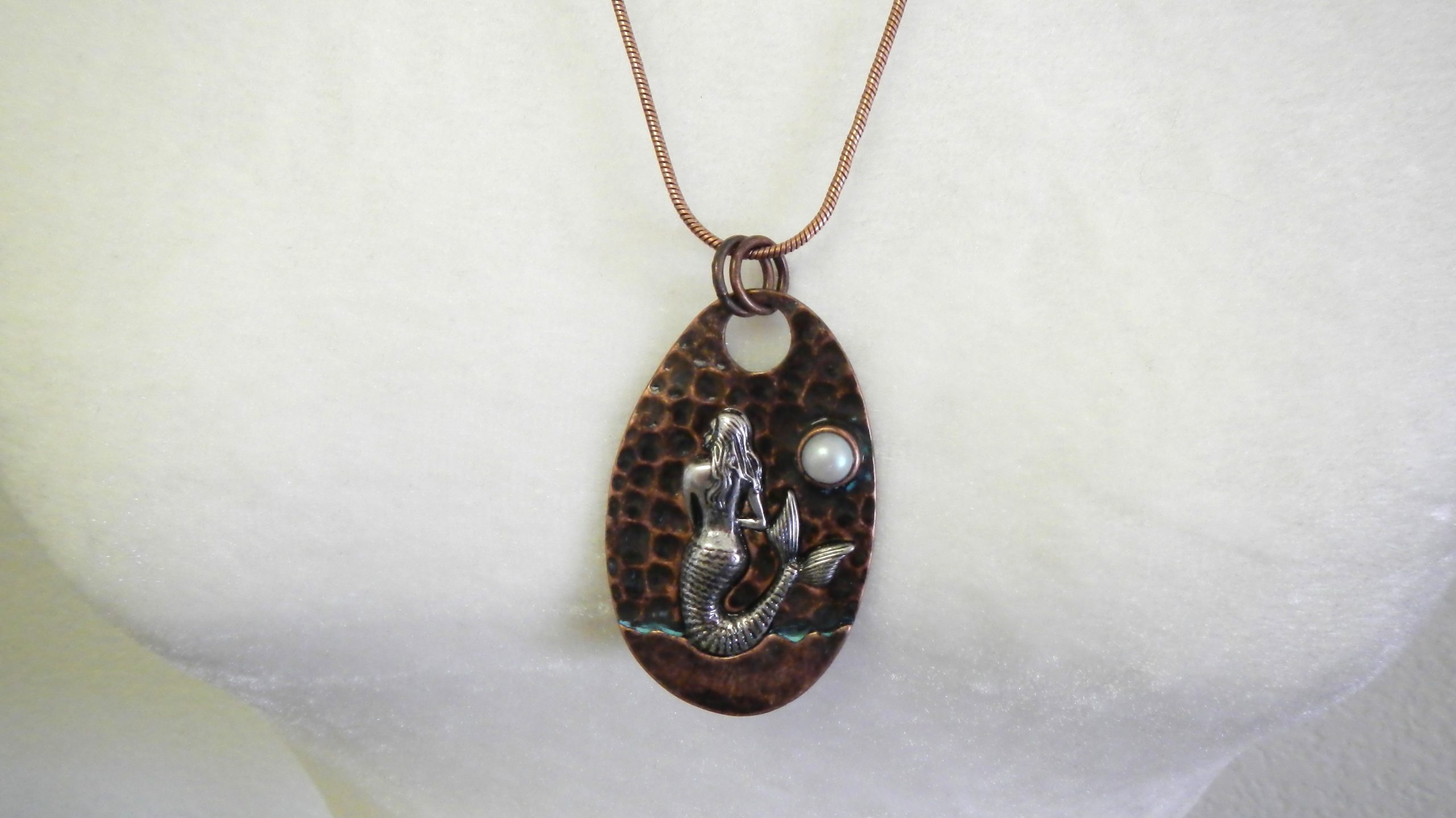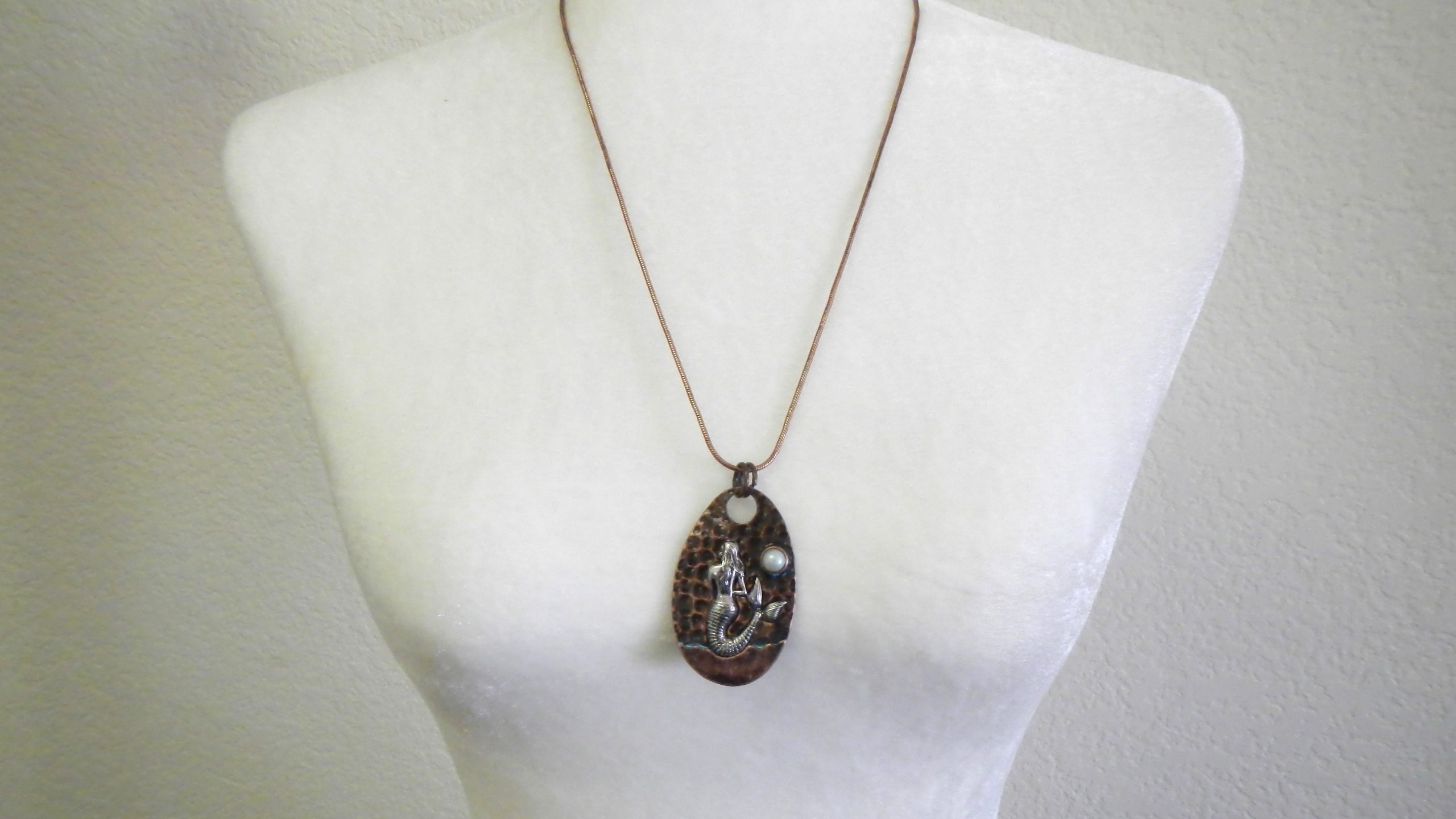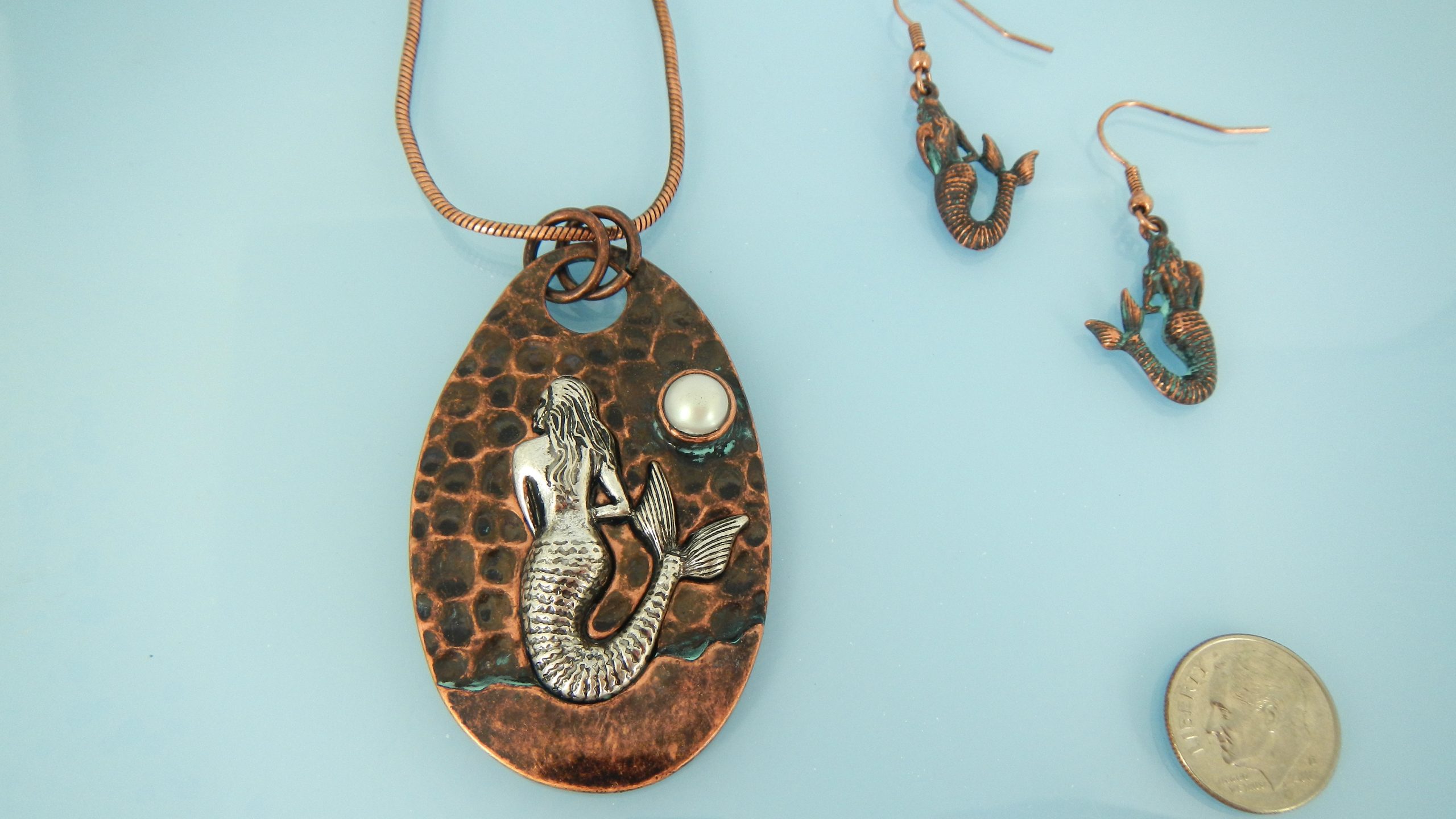 Oval copper and patina mermaid pendant and earring set