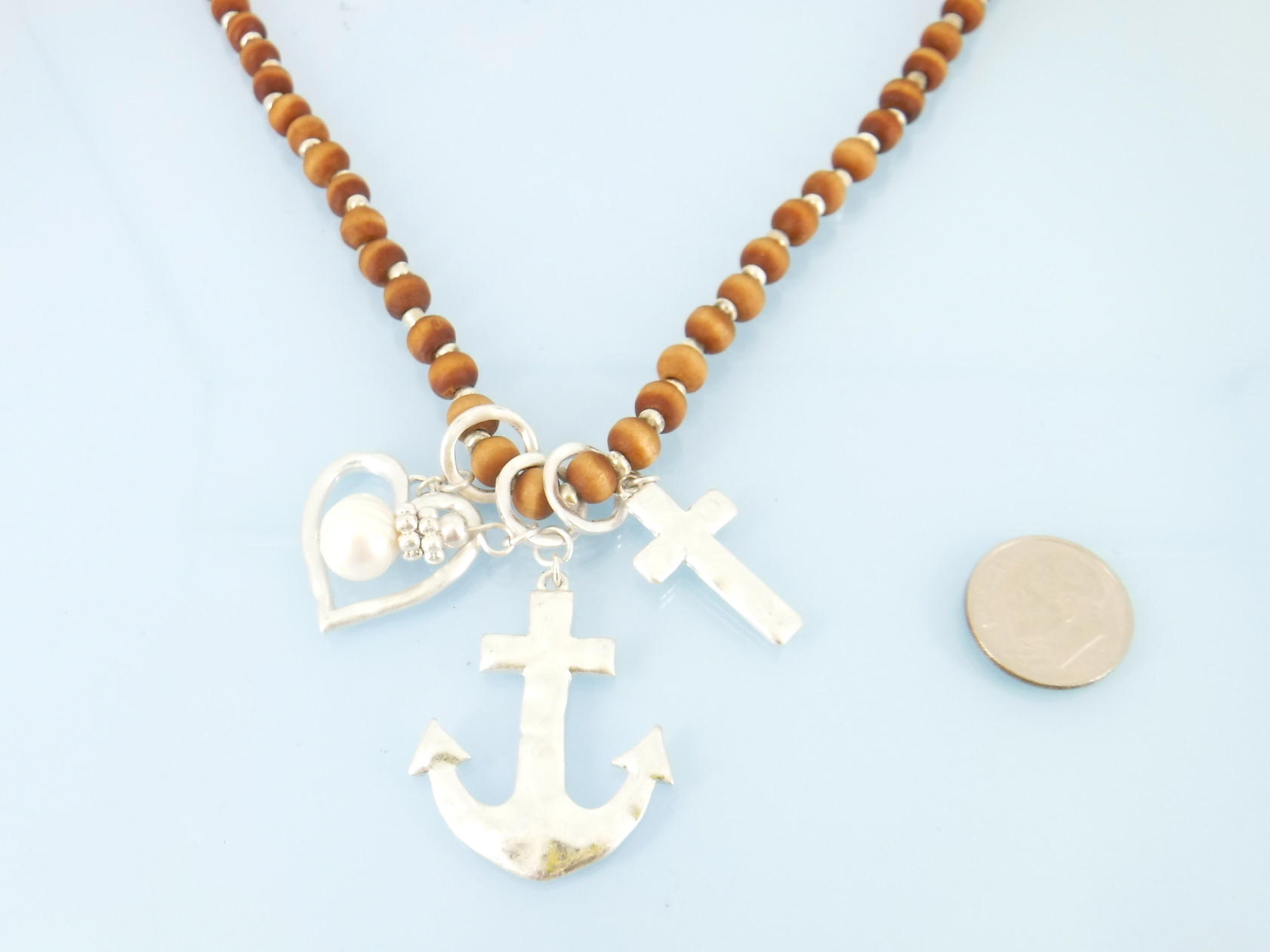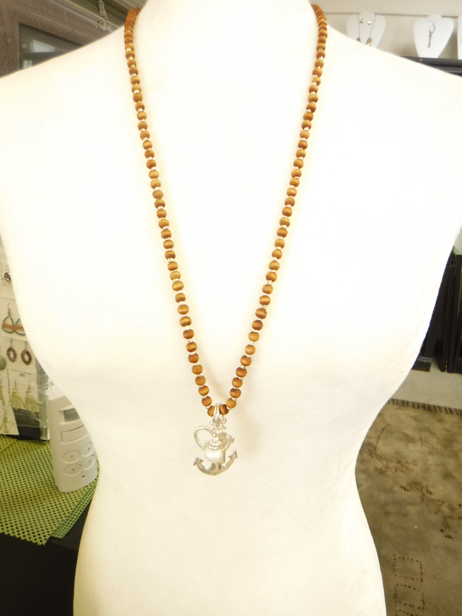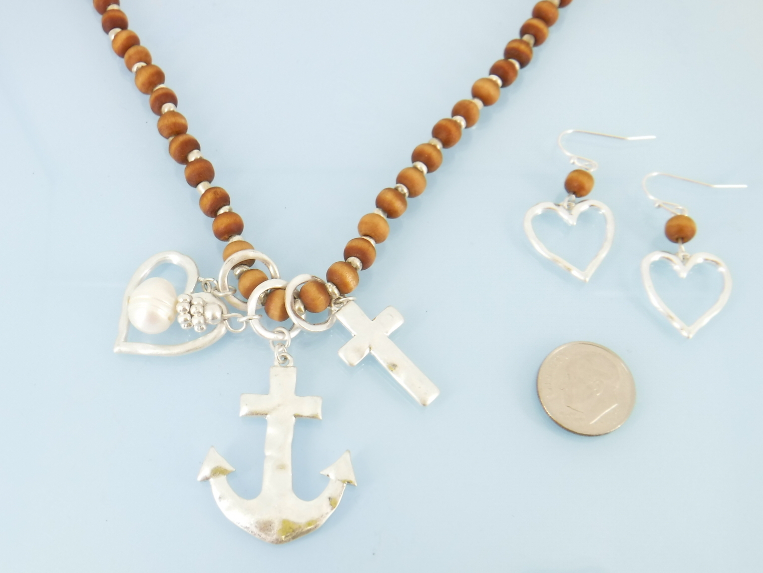 Wood bead anchor necklace and earring in gold or silver.