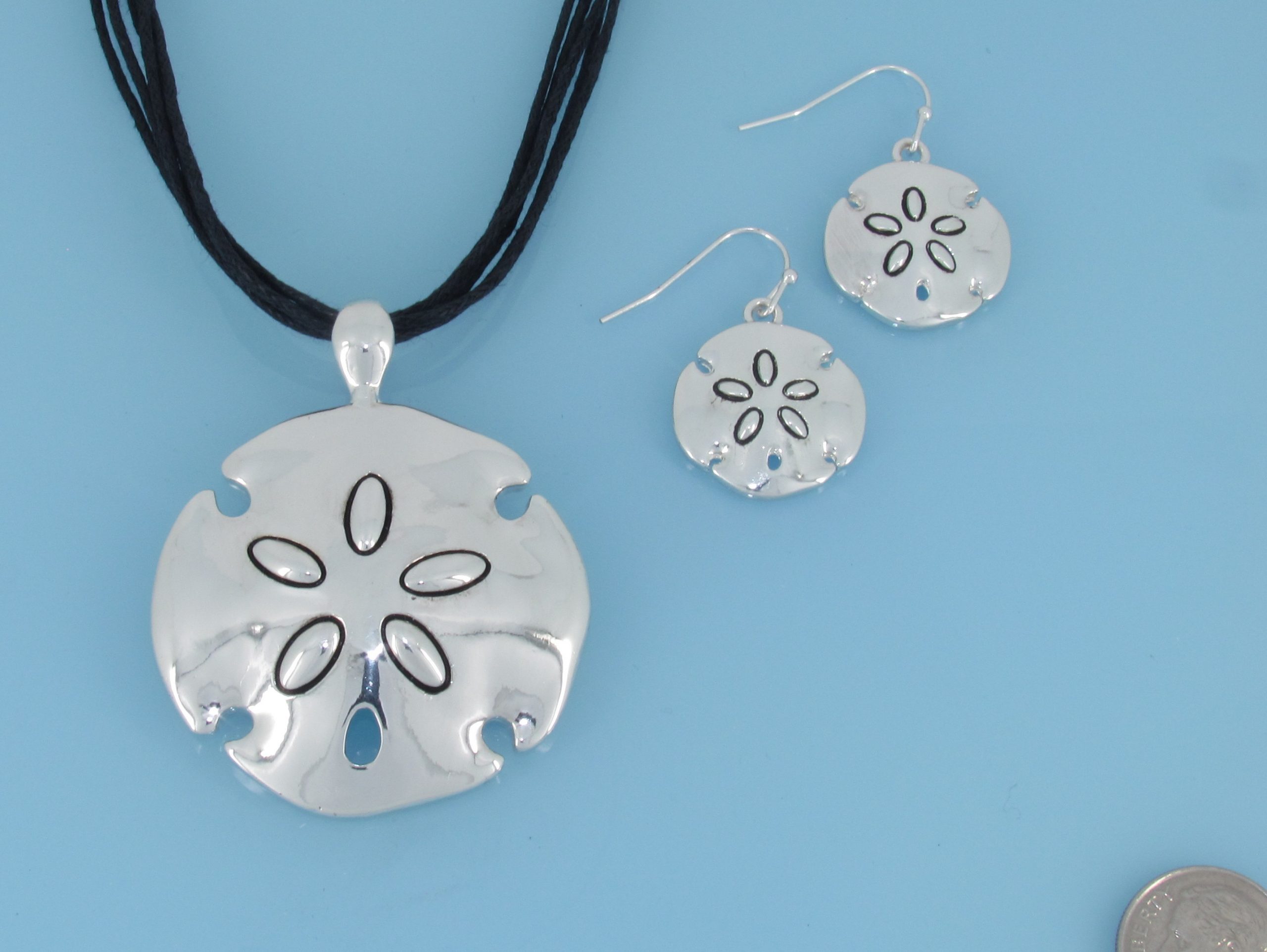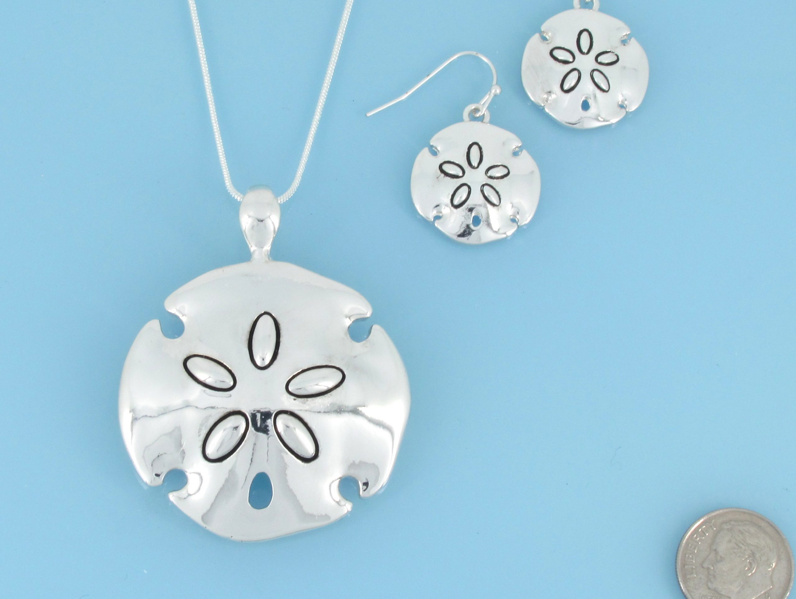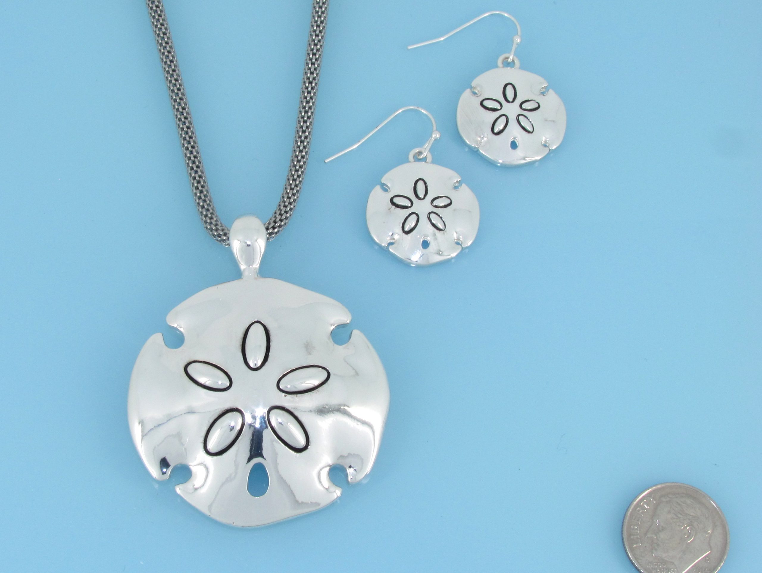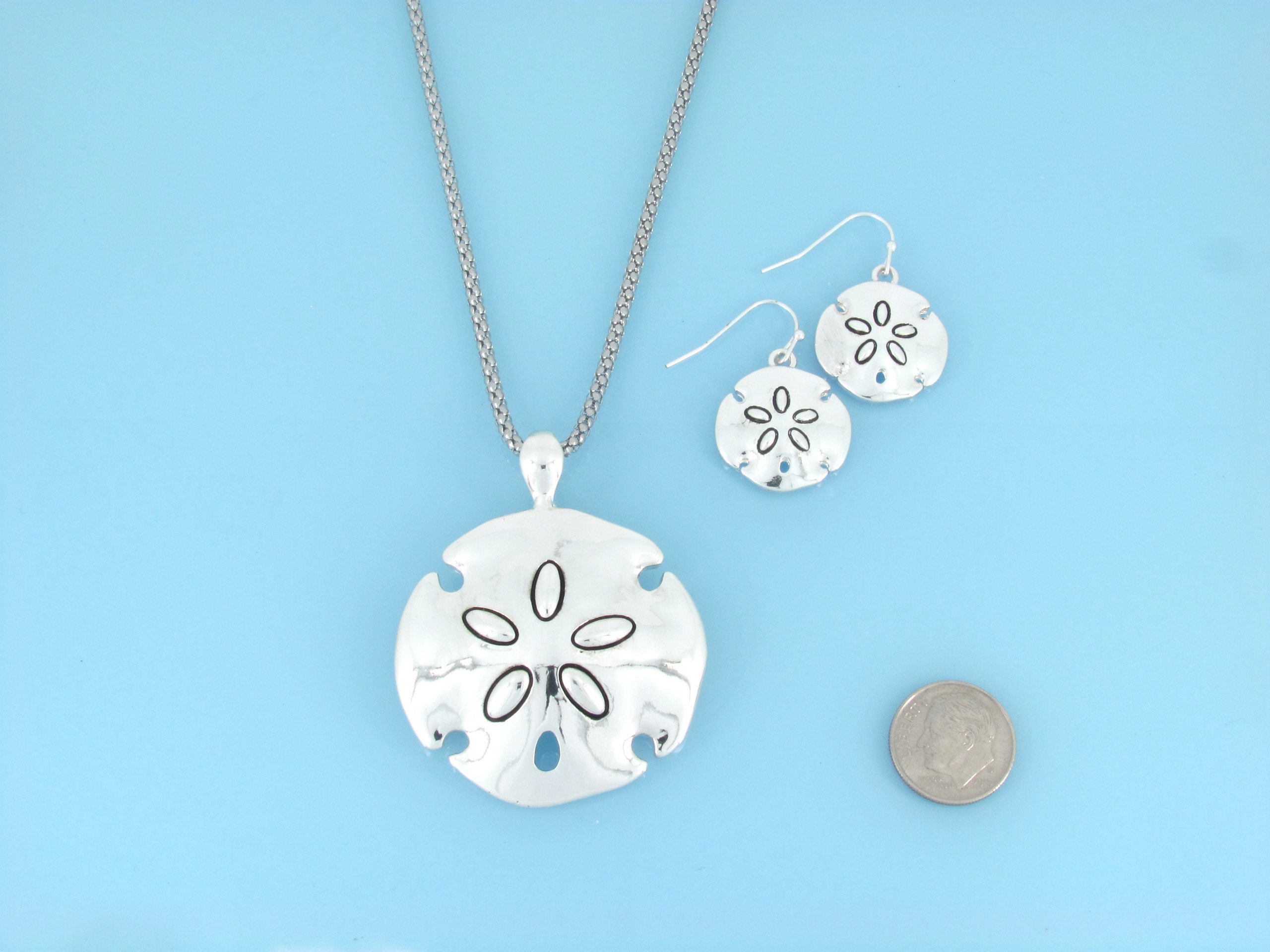Smooth sand dollar pendant and earring set on chain