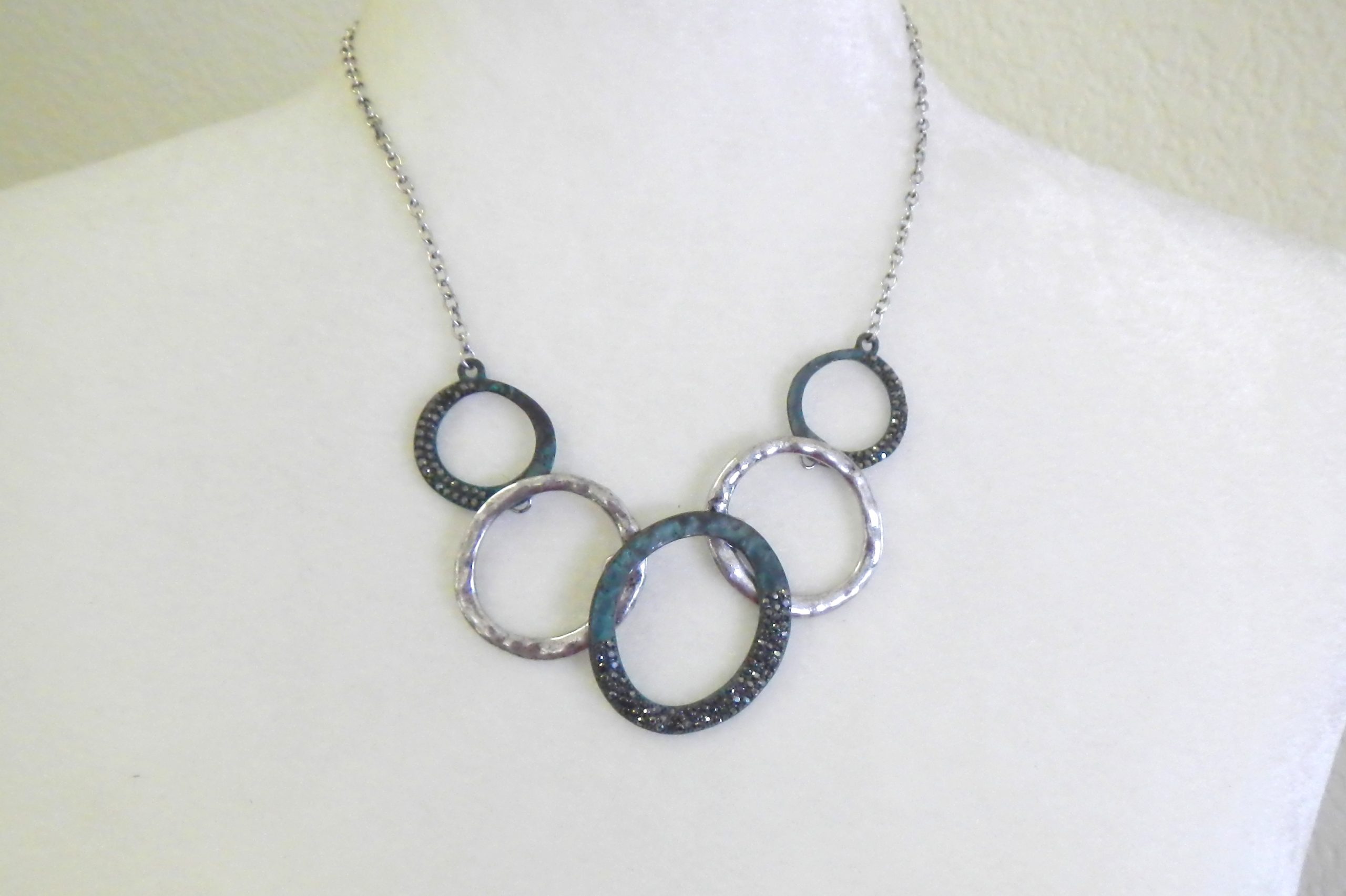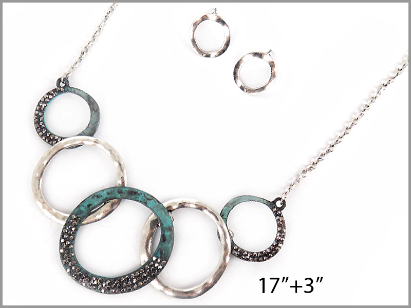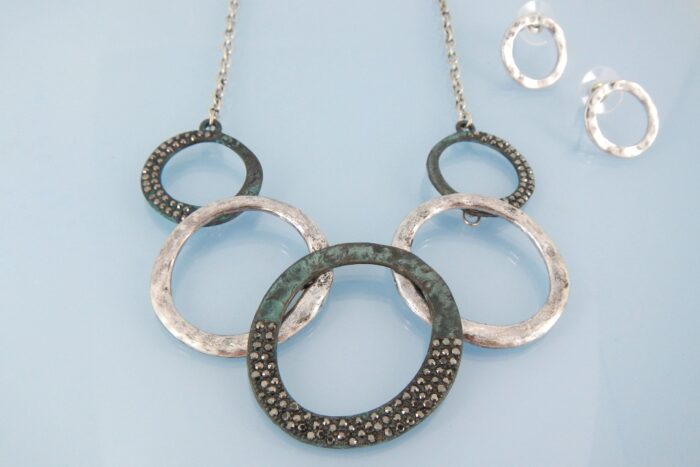 Patina and silver hoops with black stones necklace set