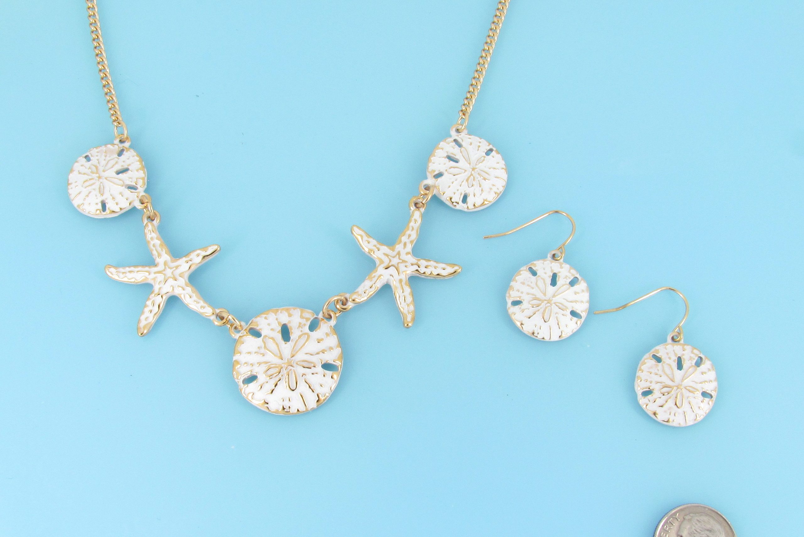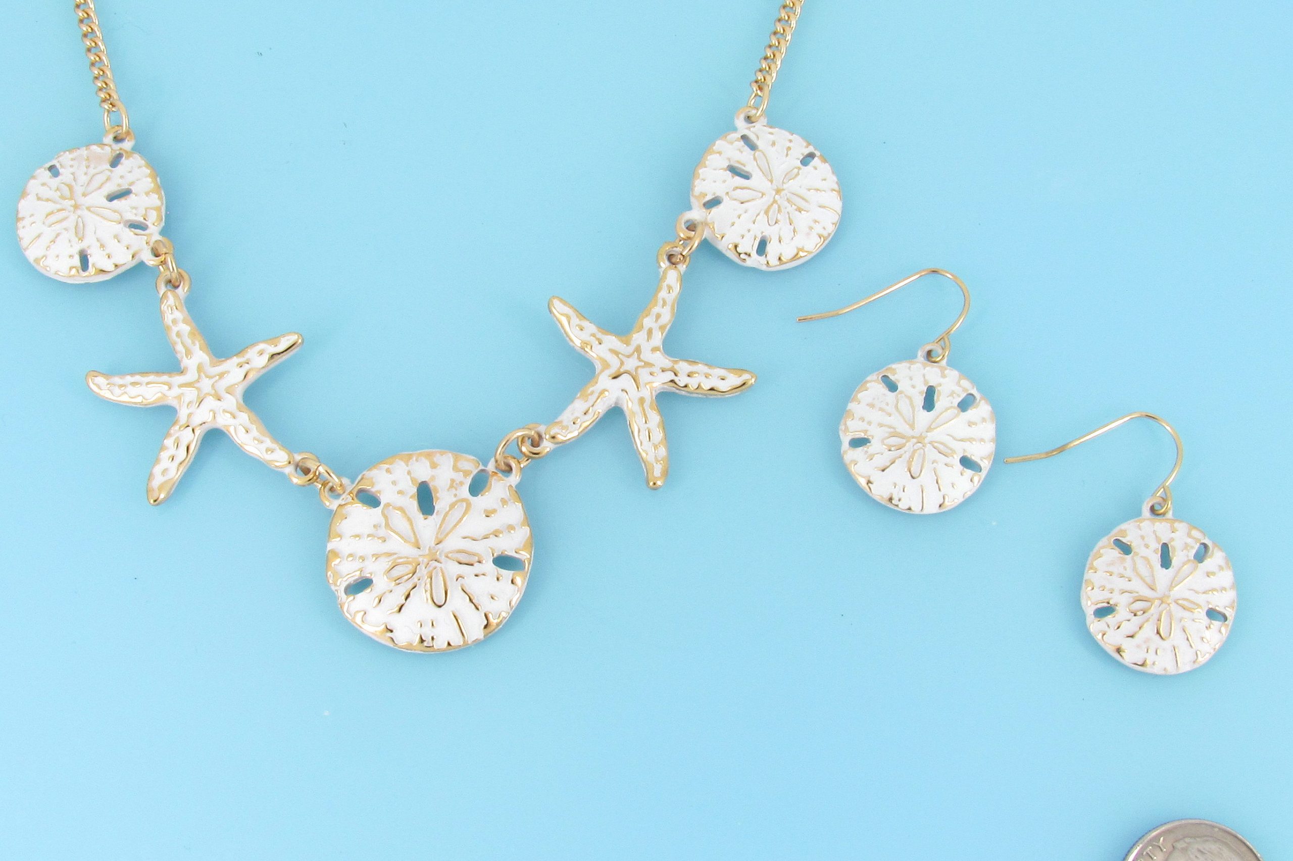 Sand dollar and starfish 5 piece necklace in gold and white with matching earrings