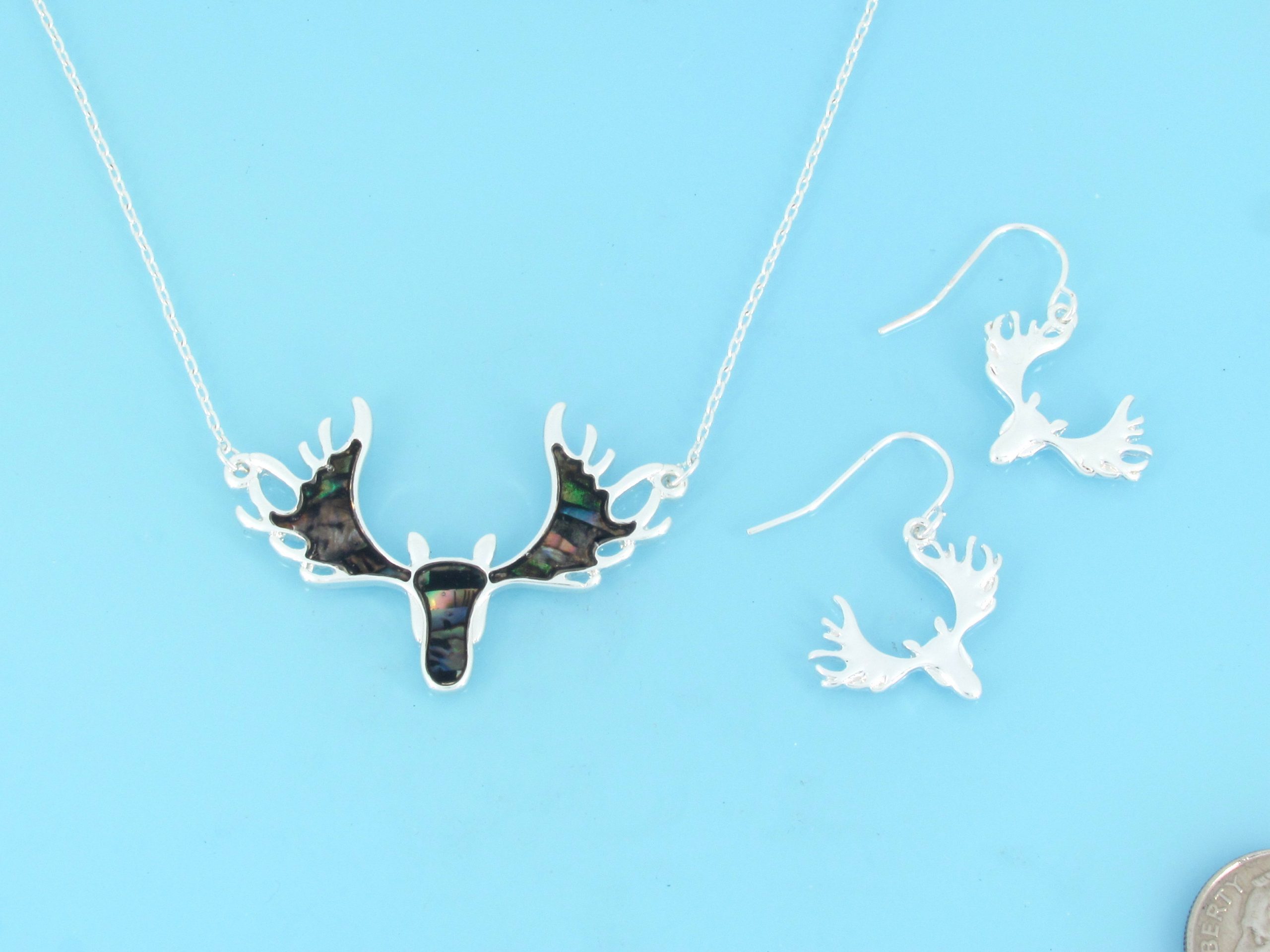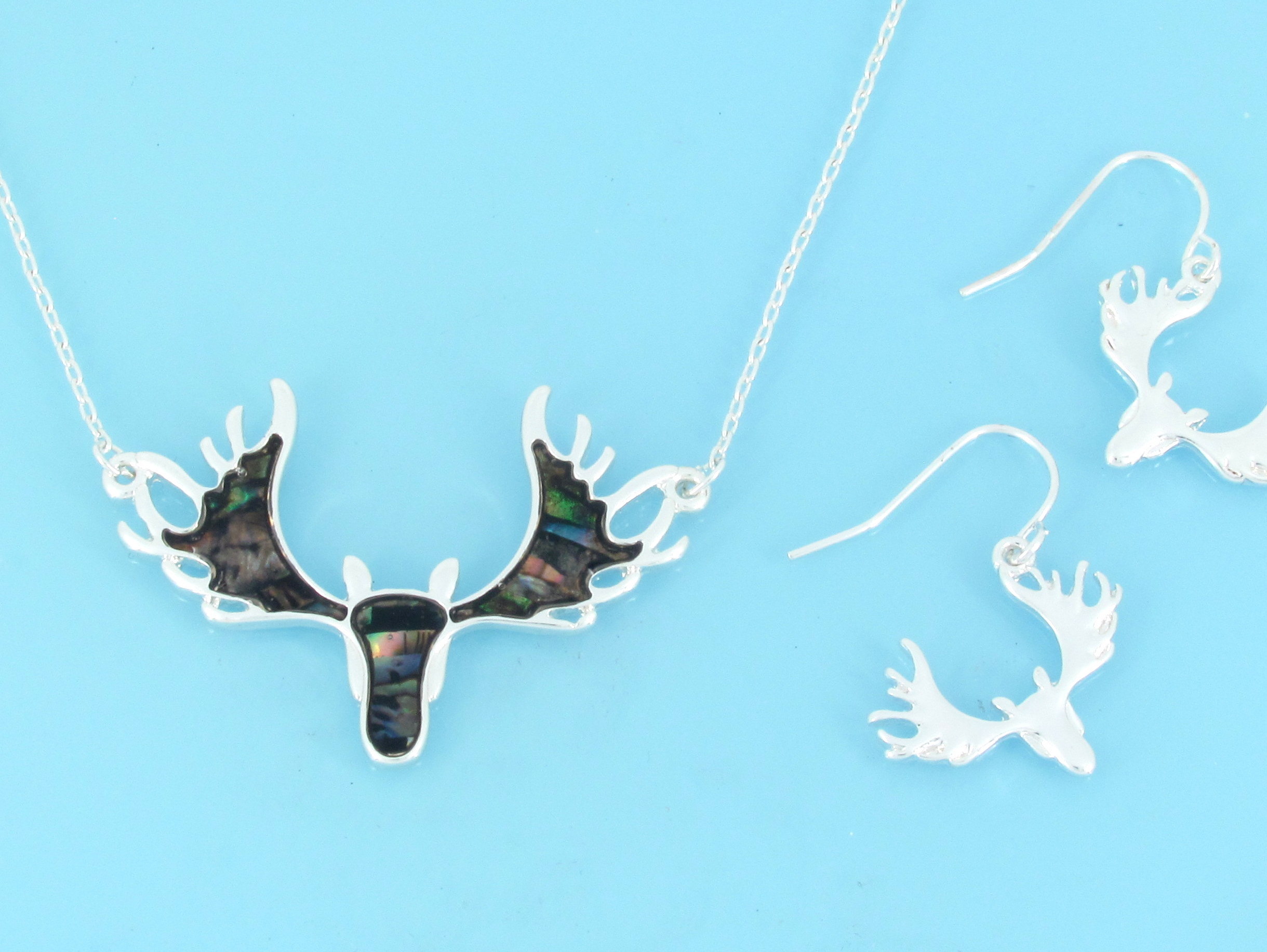 Flat abalone moose head pendant on 16″ chain with earrings