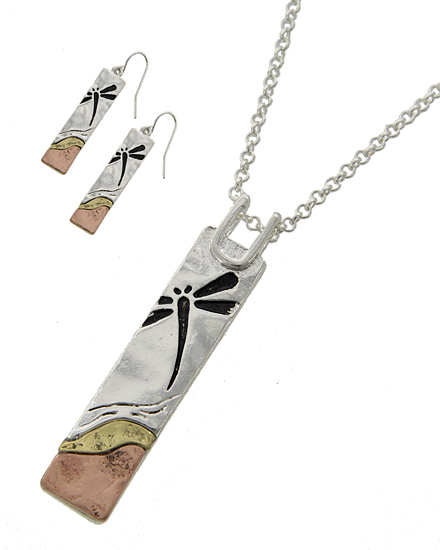 Dragonfly pendant earring set in three metals