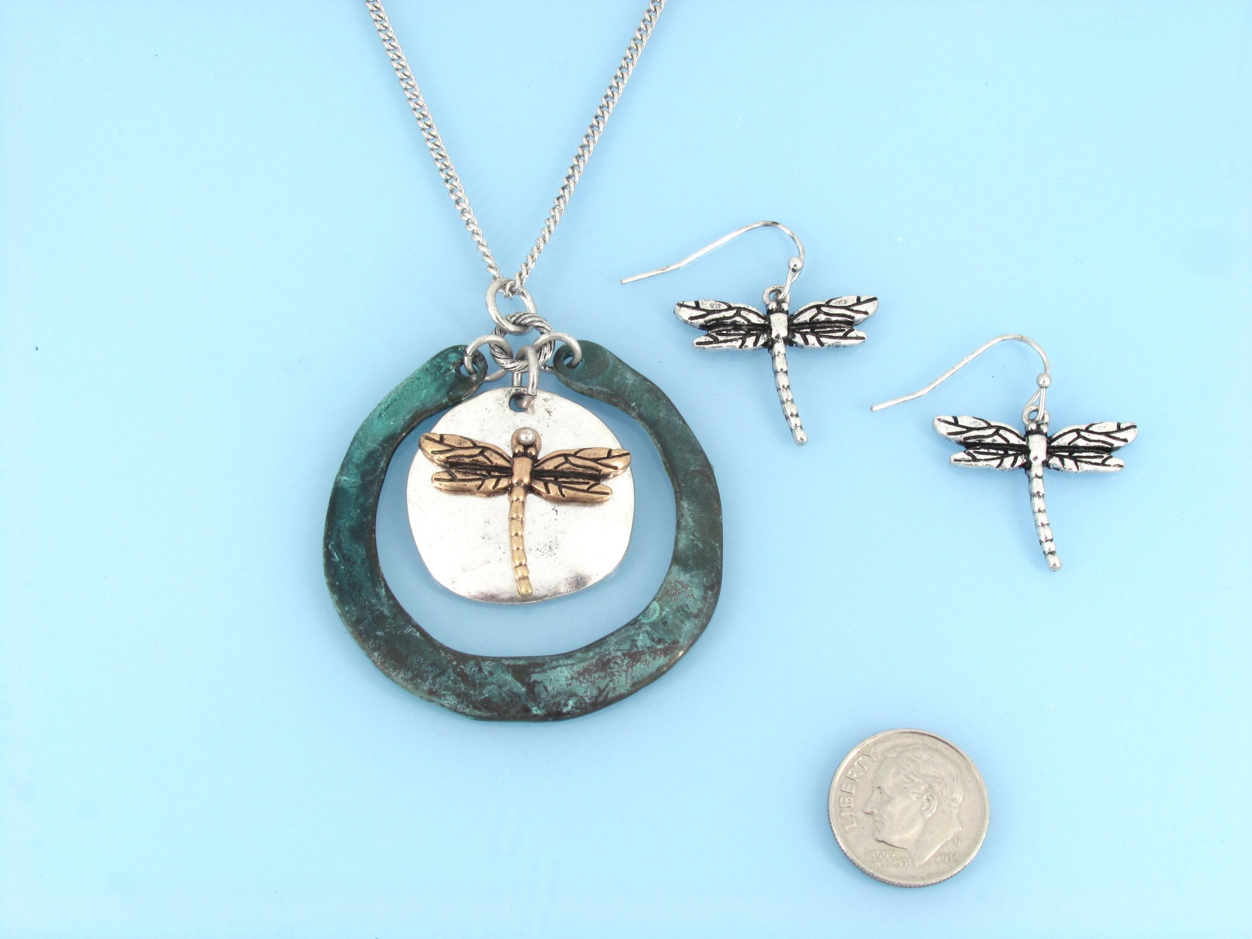 Silver, brass and patina dragonfly pendant set on 34″ chain with 3″ extender. Also one butterfly left